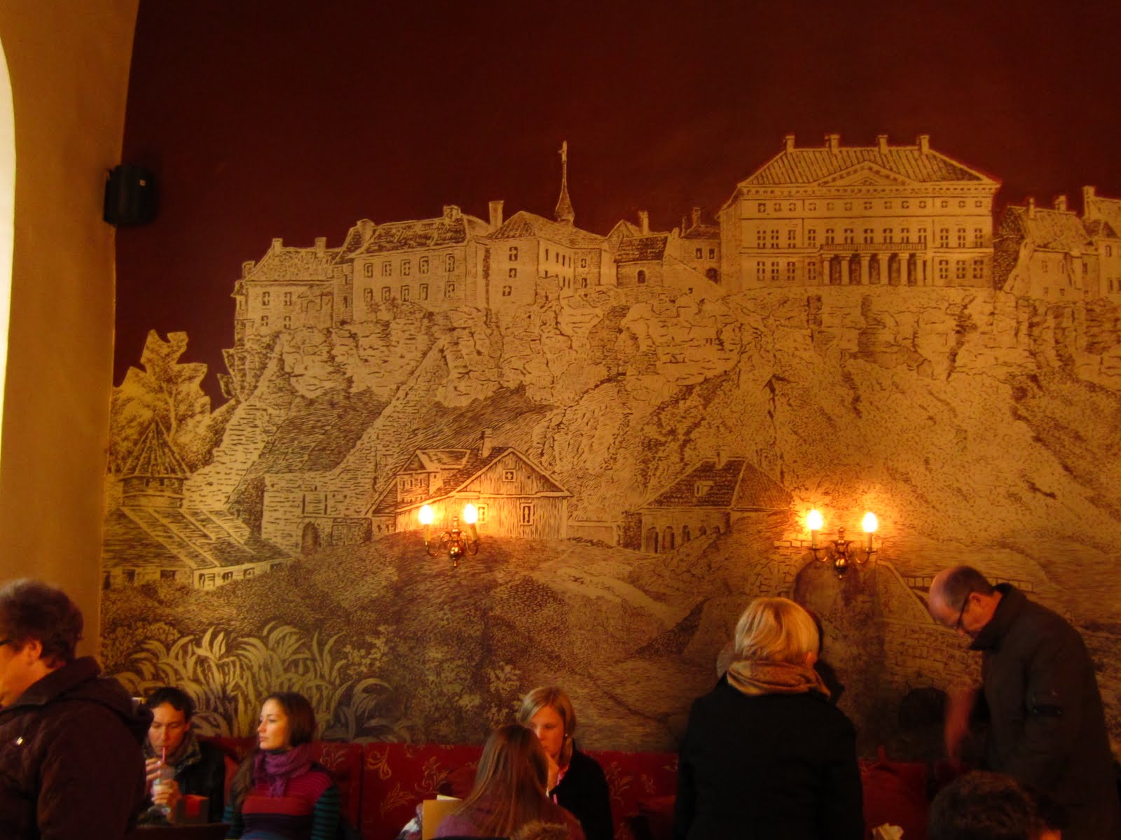 Synd att jag inte la på minnet vad detta café hette för där var så fantastiska väggar. Trodde först att hela väggen var utskuren i trä för det såg närmast ut så. Efter att jag begrundat den riktigt nära så var den faktiskt målad. En otroligt fin målning som gav en tredimensionell känsla.